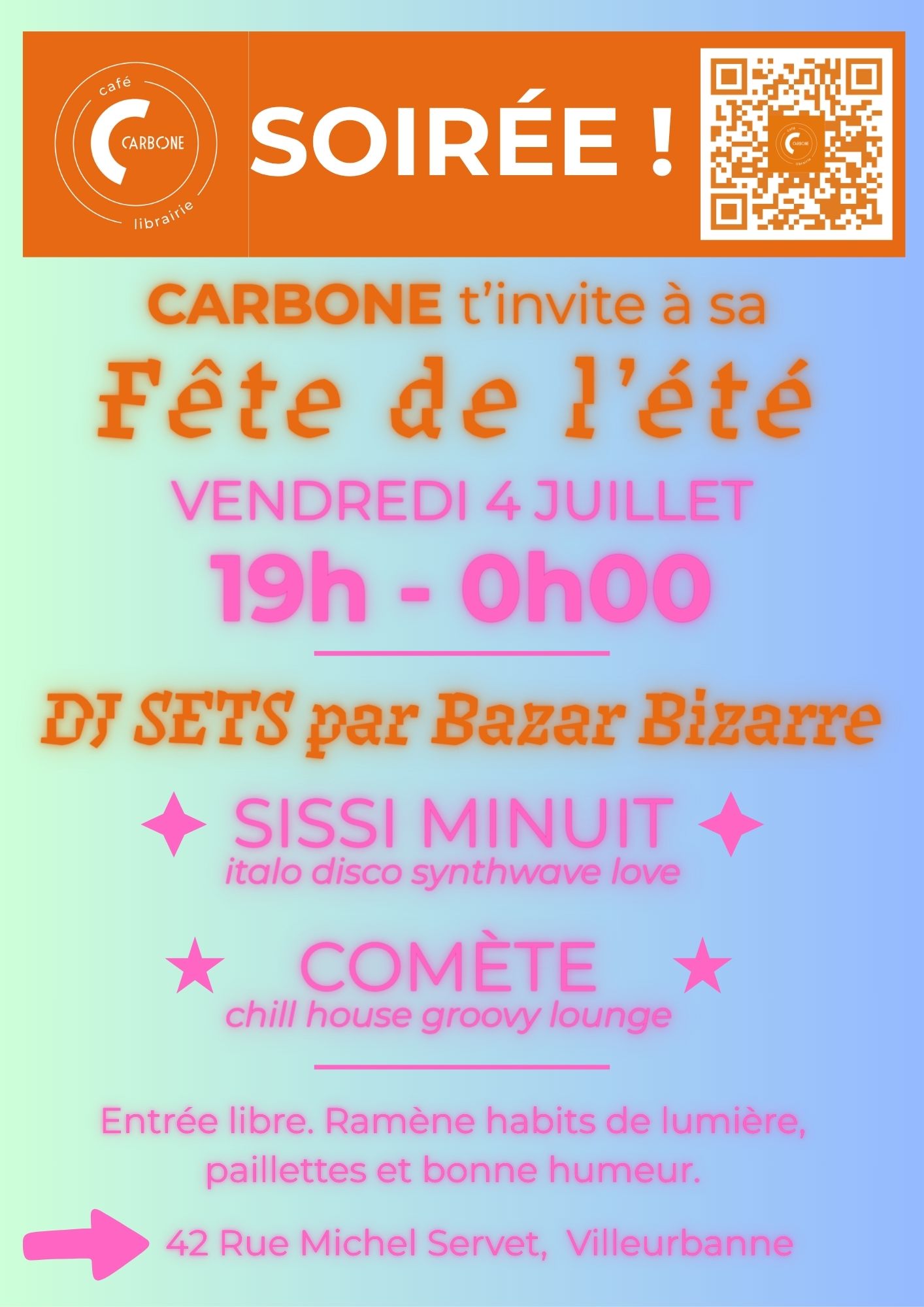 - Le vendredi 4 juillet à partir de 19h : fête de l'été du Carbone ! Venez échanger, boire un verre, et vous déhancher sur les sons de nos inarrêtables DJs, Sissi Minuit et Comète. Au programme : de la house tranquille, et de l'italo disco tous néons dehors !