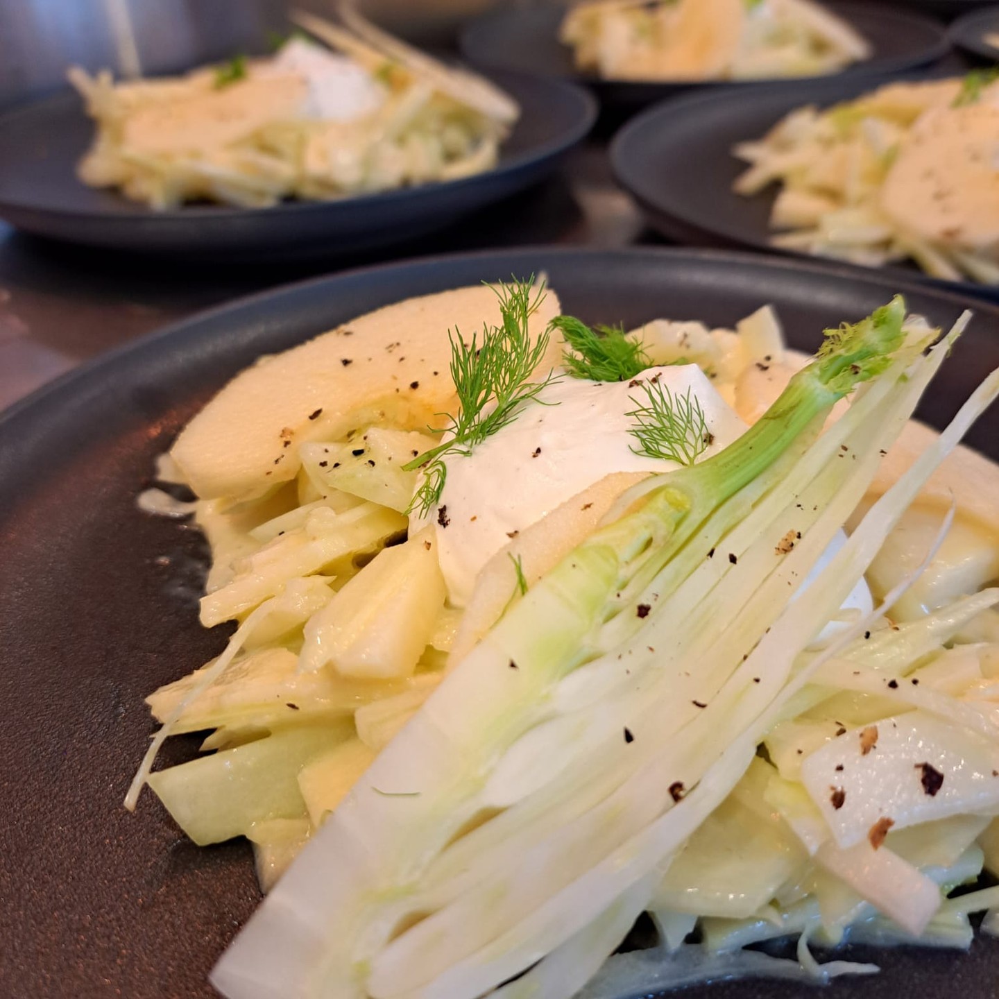 - en entrée : salade de fenouil et pomme à la chantilly de fromage blanc, assaisonnée au poivre Timut ;