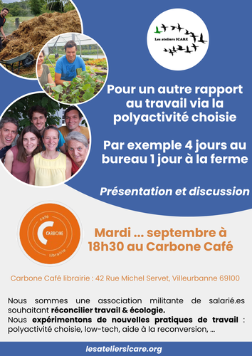 Les ateliers ICARE est une association de salarié.e.s et indépendant.e.s voulant réconcilier travail et écologie. Ils expérimentent les alternatives au productivisme, via des ateliers collaboratifs (sur les besoins sociétaux, les nouveaux métiers…) et des projets de terrain (poly-activité, low-tech…).
